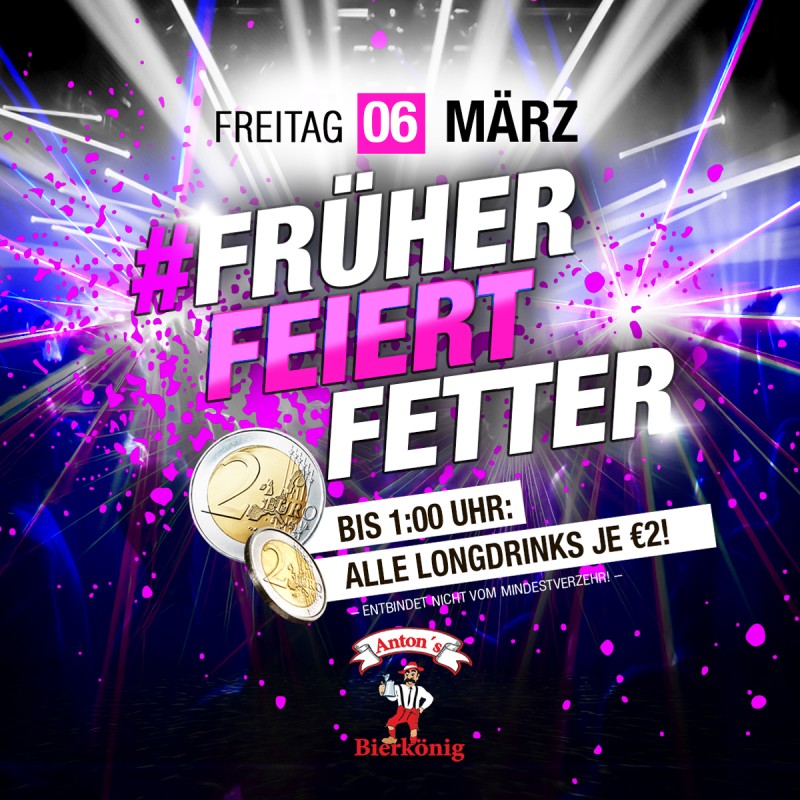 Bis 2:00 h gilt: > alle Longdrinks 2,-- € (außer Cocktails)! < Entbindet nicht vom Mindestverzehr! * siehe mehr.