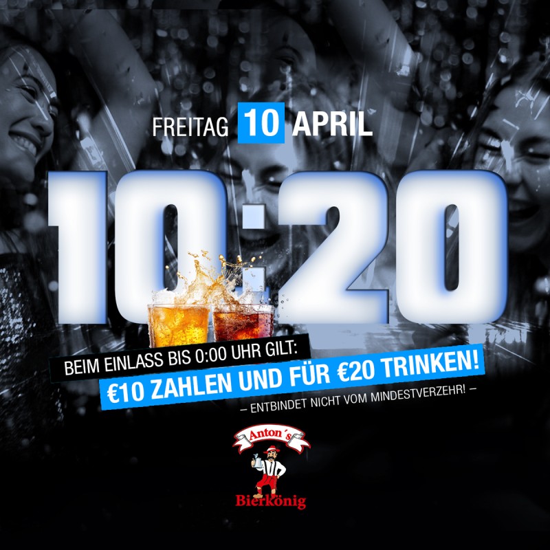 Bis 0:00 Uhr gilt: > 10,- € zahlen und für 20,- € trinken! < Entbindet nicht vom Mindestverzehr! * siehe mehr.
