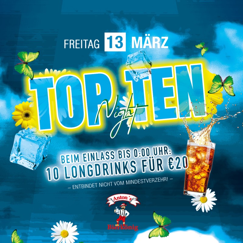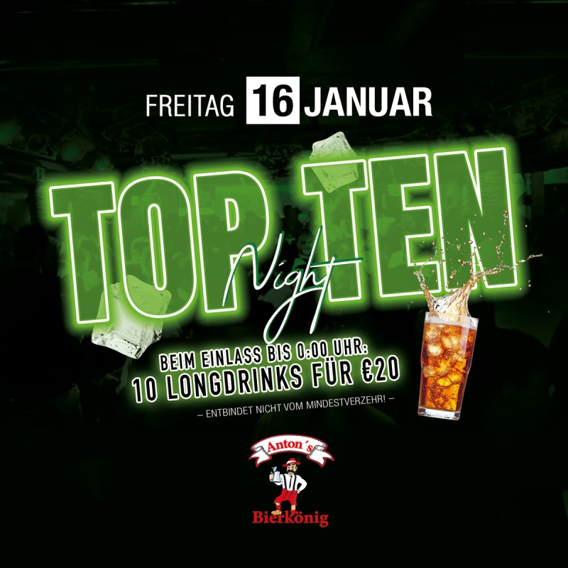 10 Longdrinks zum Preis von 20,- €! Einmalig beim Einlass bis 0:00 h ein Top Ten-Ticket erwerben! * siehe mehr.
