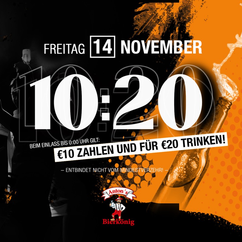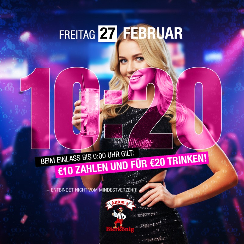 Bis 0:00 Uhr gilt: > 10,- € zahlen und für 20,- € trinken! < Entbindet nicht vom Mindestverzehr! * siehe mehr.