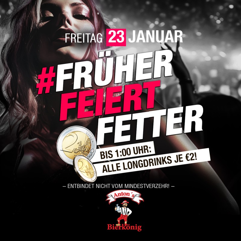 Bis 1:00 h gilt: alle Longdrinks (außer Cocktails) je 2,- €!!! Entbindet nicht vom Mindestverzehr! * siehe mehr.