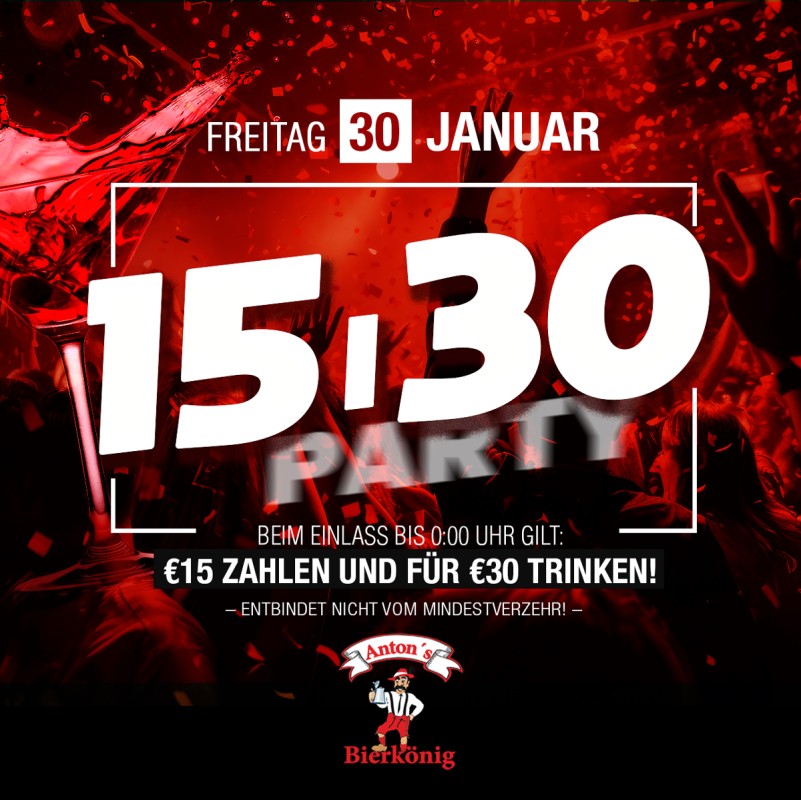 15,- € zahlen und für 30,- € trinken! Heute einmalig beim Einlass bis 0:00 h eine 15,-€/30,- € - Sonderkarte erwerben! * siehe mehr.